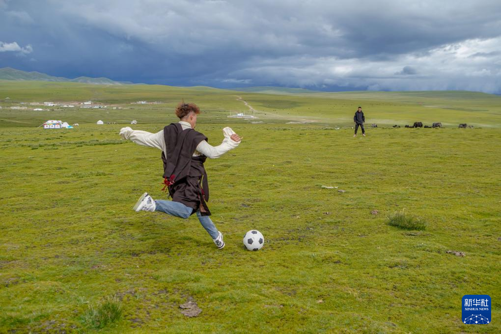 8月11日,旦增旺久和朋友在草原上踢足球。旦增旺久是次扎達(dá)兒子列熱覺旦的表哥,遠(yuǎn)在千里之外的湖南上學(xué),但還會經(jīng)常想起“隆達(dá)熱巴”。正值暑假,回到草原的他會細(xì)心地為“隆達(dá)熱巴”梳毛,跟它說悄悄話。新華社記者 邵澤東 攝