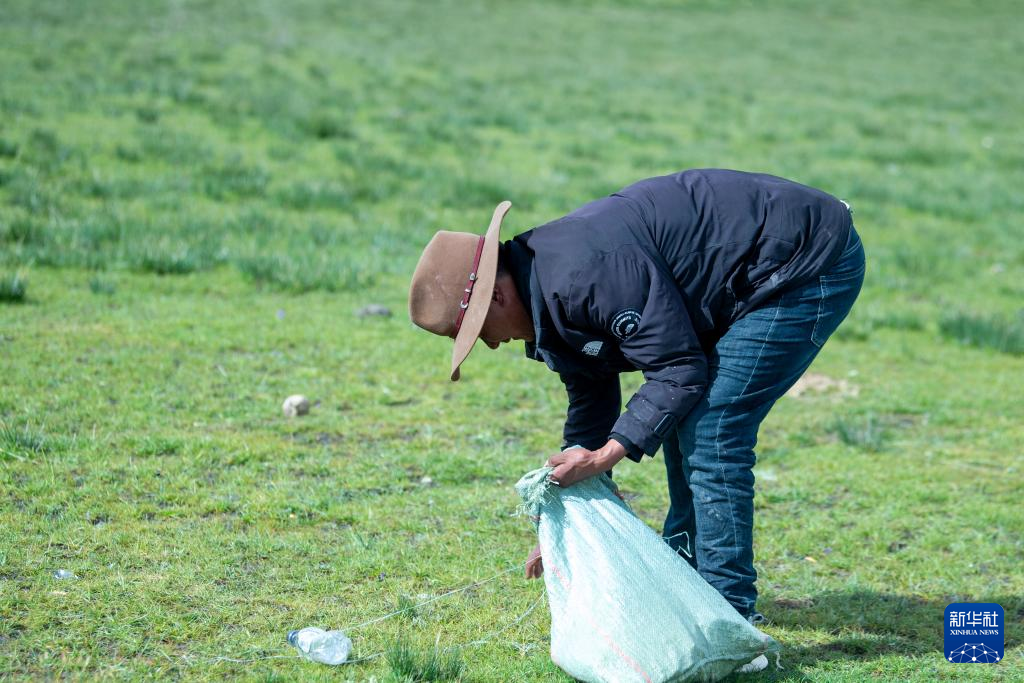 8月11日,次扎達(dá)在轉(zhuǎn)換牧場時(shí)撿拾生活垃圾。新華社發(fā)(旦增努布攝)