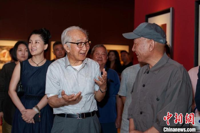 “藏色——巴瑪扎西畫展”亮相中國美術(shù)館,圖為中國美術(shù)家協(xié)會名譽主席、著名畫家靳尚誼(前排左一)與藏族畫家巴瑪扎西(右一)交流?!“椴匚幕﹫D