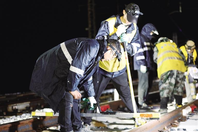 21時30分,作業(yè)中,暴雨傾盆而下,瞬間覆蓋了整個施工現(xiàn)場,噼里啪啦地打在現(xiàn)場作業(yè)人員身上。早已經(jīng)歷過無數(shù)次風(fēng)雨洗禮的他們,握緊手中的工具,按照分工忙碌起來,有的測量數(shù)據(jù)、有的配合作業(yè)、有的檢查設(shè)備、有的盯控安全……整個作業(yè)現(xiàn)場忙而有序,這場突降的暴風(fēng)雨,儼然已成為促使他們奮進(jìn)的鼓點(diǎn),他們正用昂揚(yáng)的斗志,奏響高原鐵路人的“天路夜曲”。