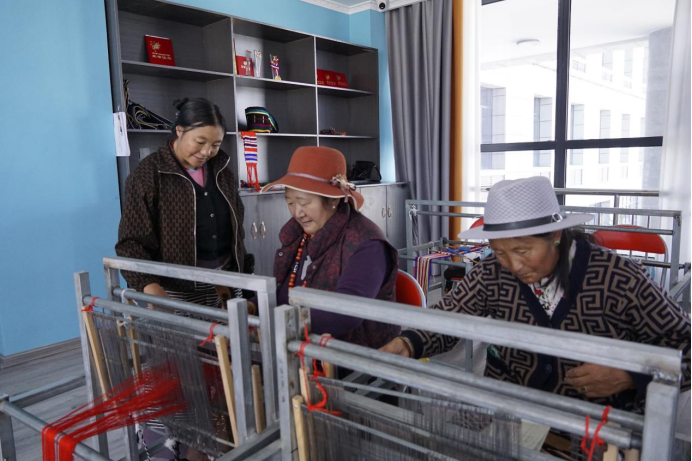 圖為綜合實訓樓內,曲增(左)在教當地農牧民制作藏式腰帶