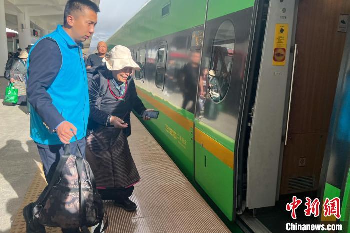 圖為西藏日喀則站工作人員攙扶老人乘車高原復(fù)興號。日喀則站 供圖