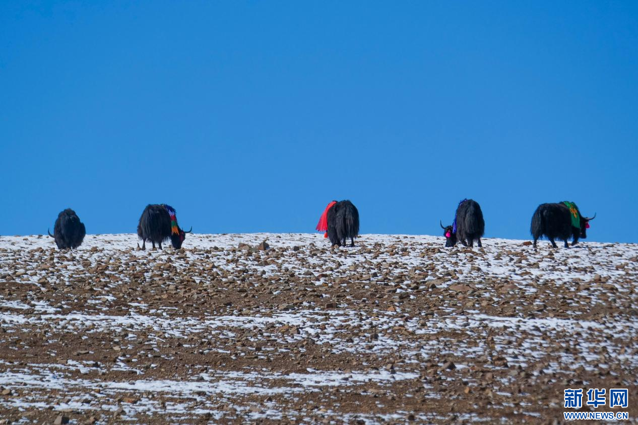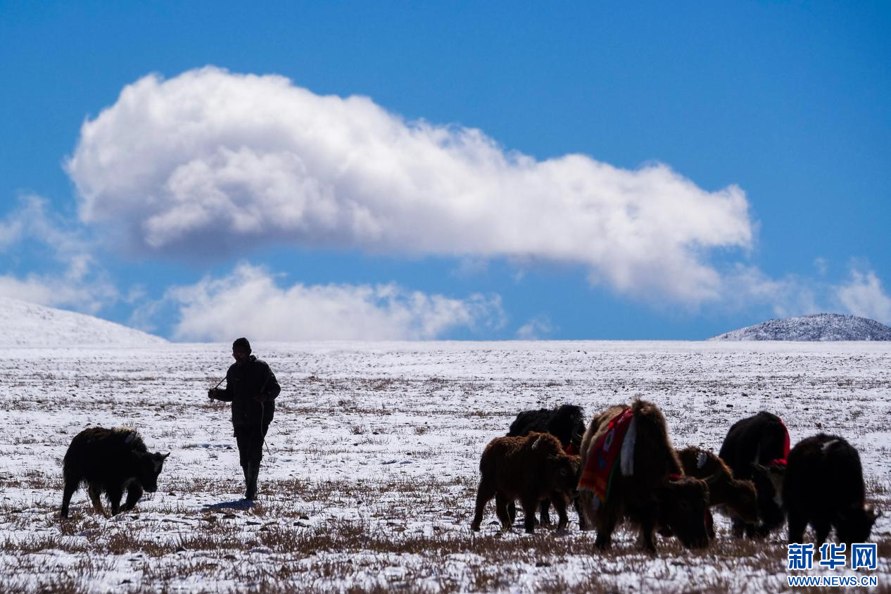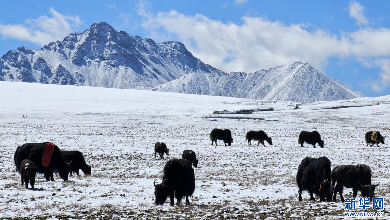 10月13日,在山南市措美縣境內雪山腳下拍攝的牦牛。新華網 柑丹鴦琦 攝