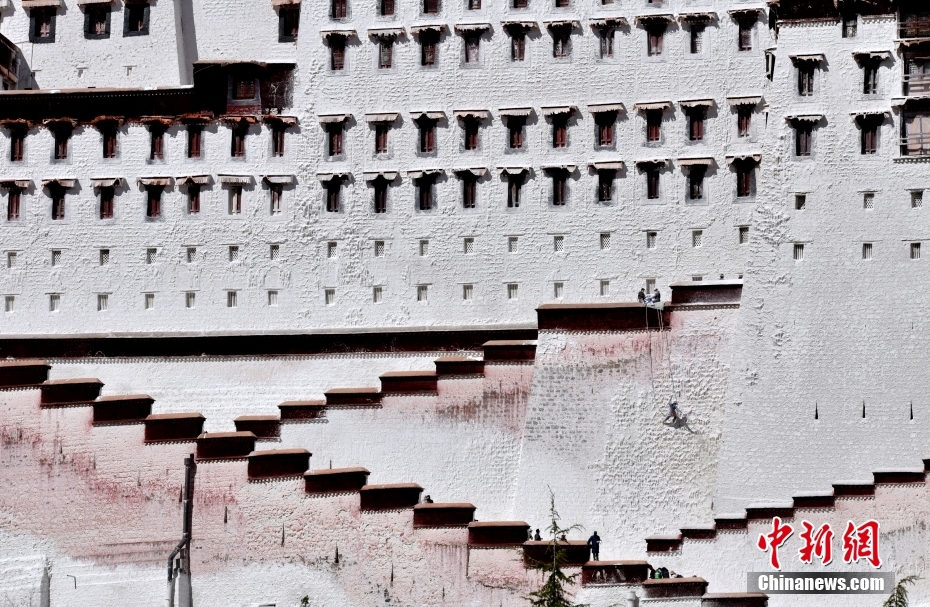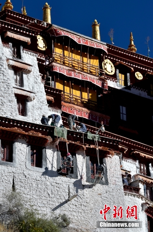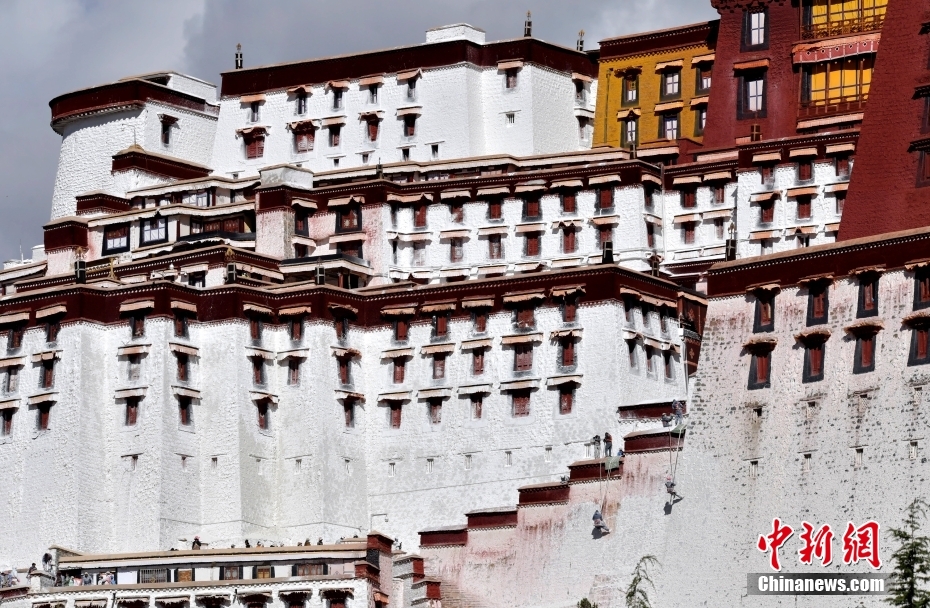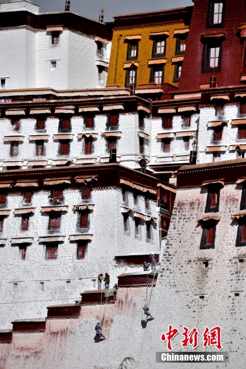10月19日,西藏拉薩,工作人員對(duì)布達(dá)拉宮外墻噴灑涂料。每年秋冬交替時(shí)節(jié),布達(dá)拉宮外墻都要進(jìn)行粉刷“美顏”。按照慣例,每季粉刷將在藏歷9月22日“神降節(jié)”前完成。
