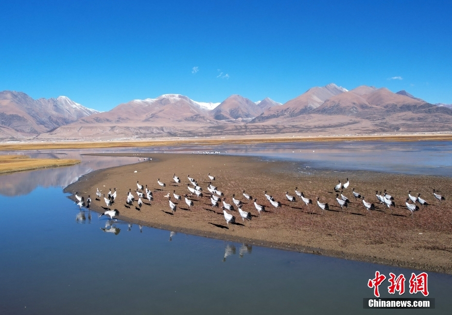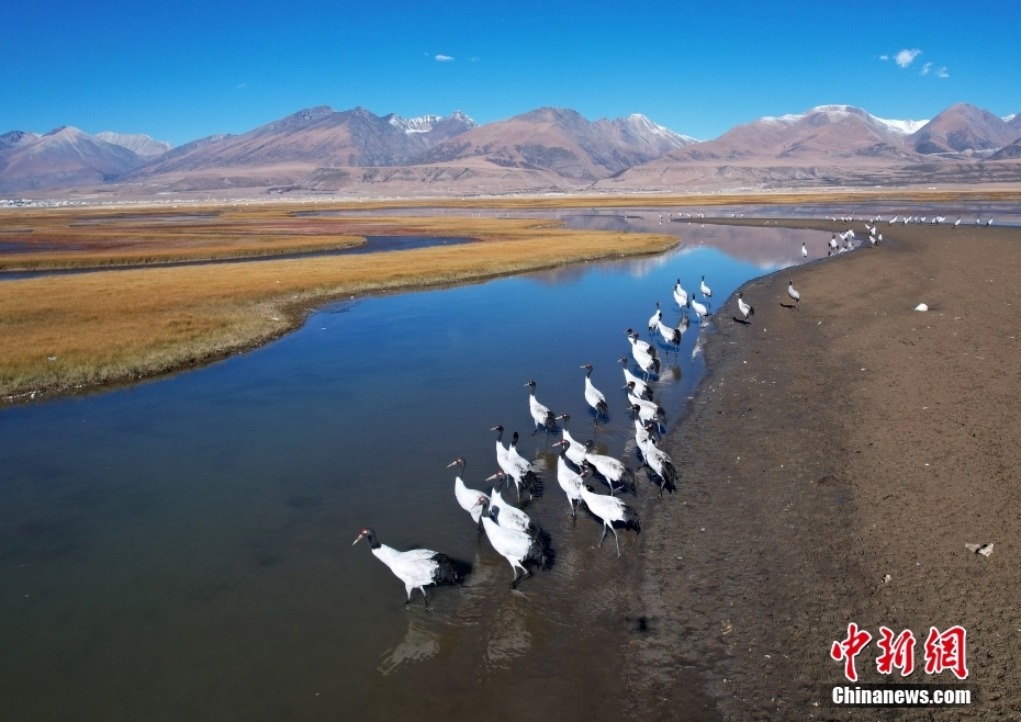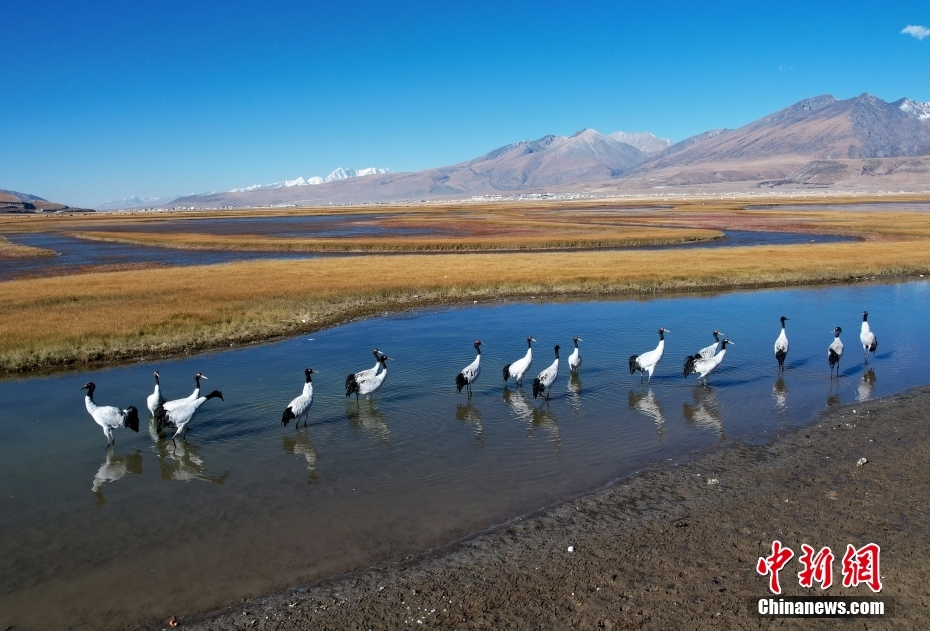 10月23日,成群的黑頸鶴在拉薩市當雄縣阿熱濕地內(nèi)覓食。黑頸鶴是全球十五種鶴類中,唯一在高原地區(qū)繁殖和越冬的鶴類,屬中國國家一級保護野生動物。(無人機照片)