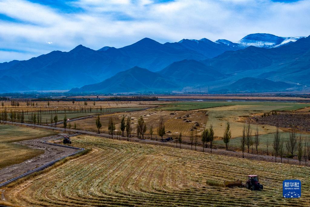 10月24日,村民駕駛農(nóng)機在拉薩市林周縣強嘎鄉(xiāng)曲嘎強村收割牧草(無人機照片)。新華社記者 姜帆 攝