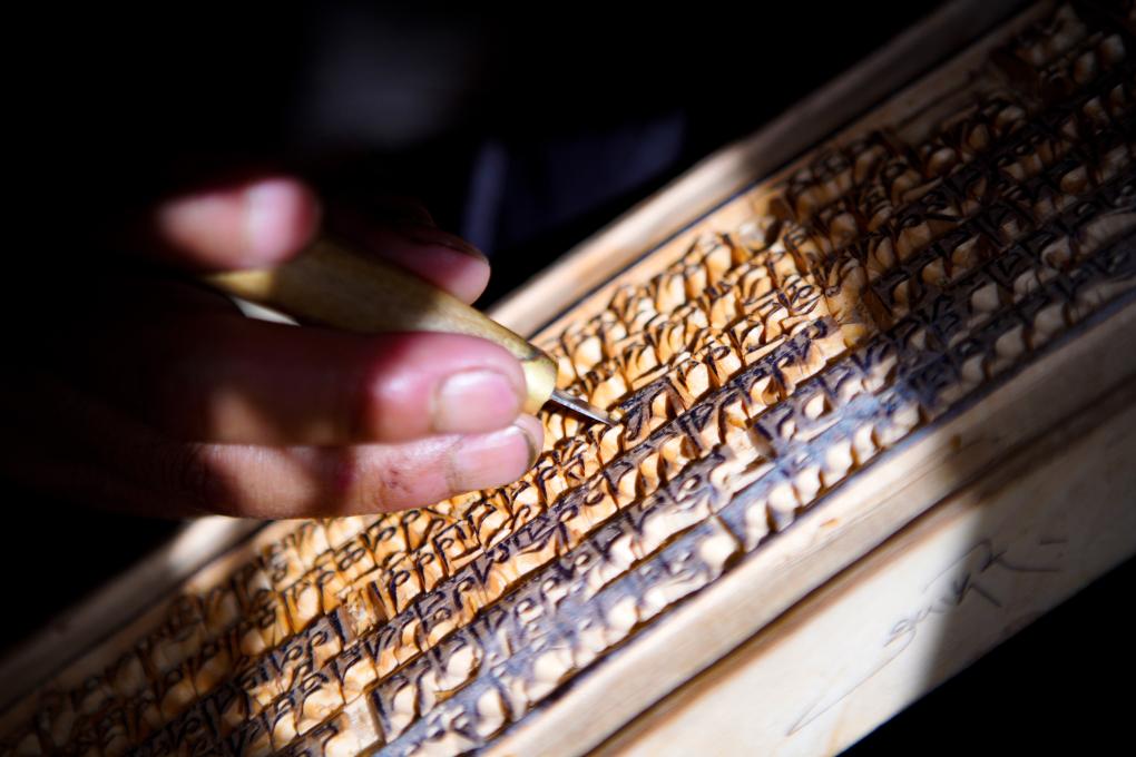 波羅刻版制作并不容易,包括切割、曬油、加固等十多道工序。澤培說:“我們一般選用優(yōu)質(zhì)的紅樺樹,必須要耐磨、沒有裂縫。正式刻制時,每一個字都必須與模板相對應,不能跑偏、變形。要想雕刻好,需要熟練掌握藏文書法等相關(guān)知識。一個字刻壞了,整個作品就毀了?!?/p>