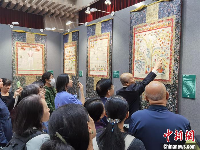 此次展覽的藏醫(yī)唐卡共30幅,精選自全套西藏自治區(qū)藏醫(yī)院(門孜康)版藏醫(yī)唐卡。此前,北京藏醫(yī)院聘請西藏著名唐卡畫家、書法家,歷時數(shù)載,復(fù)制了該版藏醫(yī)唐卡。全套共80幅,由6487幅小圖組成,內(nèi)容包括藏醫(yī)藥學(xué)的起源、歷史源流、藏醫(yī)藥理論、臨床治療、藥物方劑、炮制加工和天文歷算等。