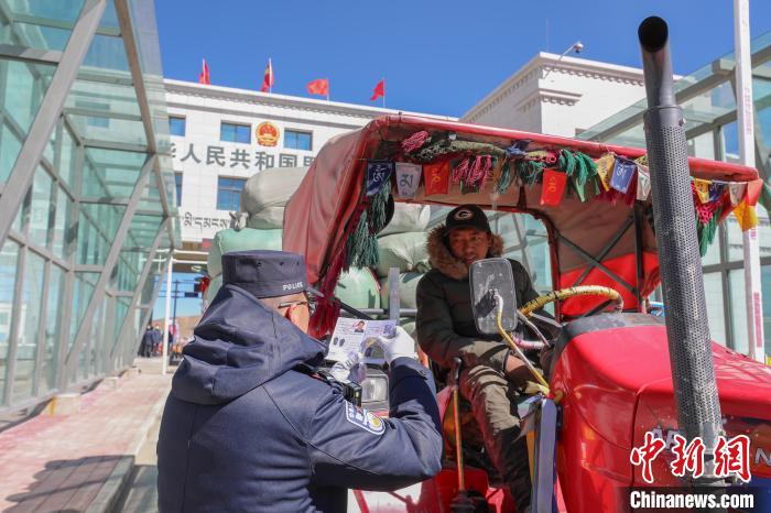 圖為里孜出入境邊防檢查站移民管理警察查驗(yàn)首臺(tái)通關(guān)車輛。郭遠(yuǎn)敬 攝
