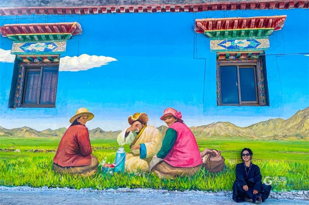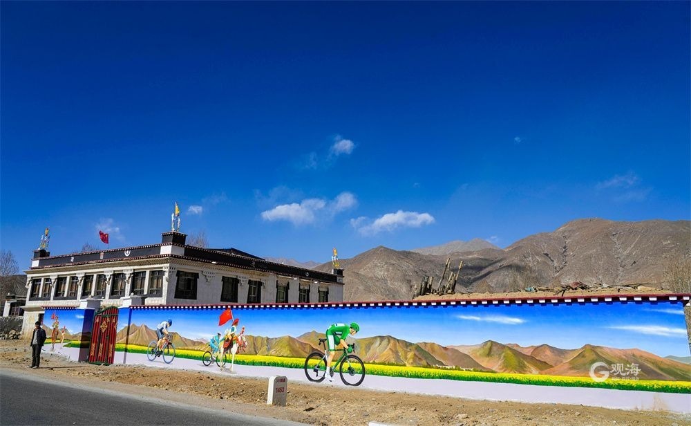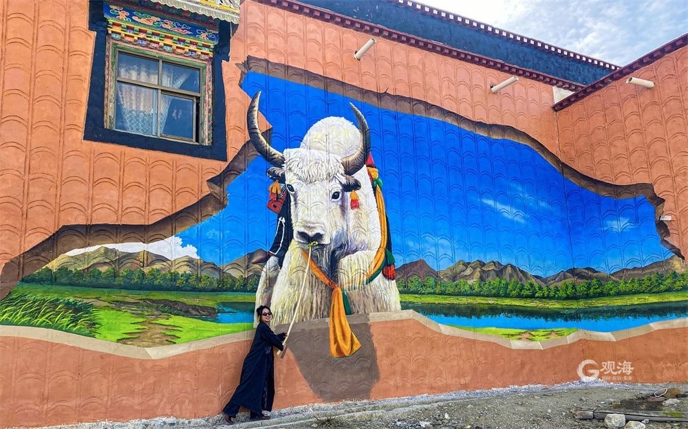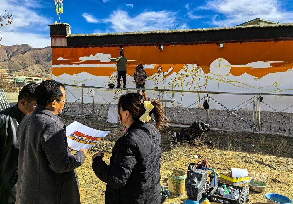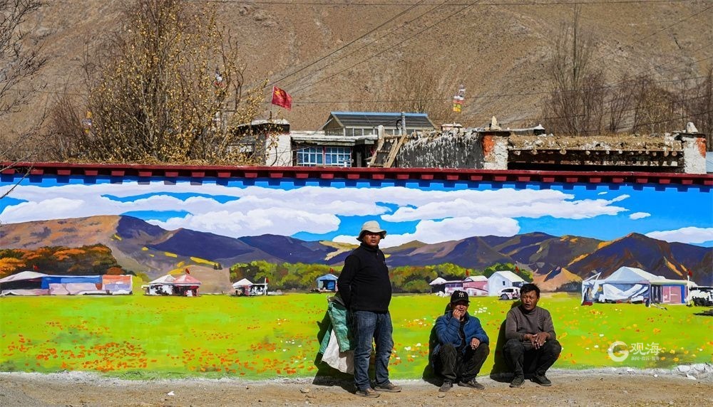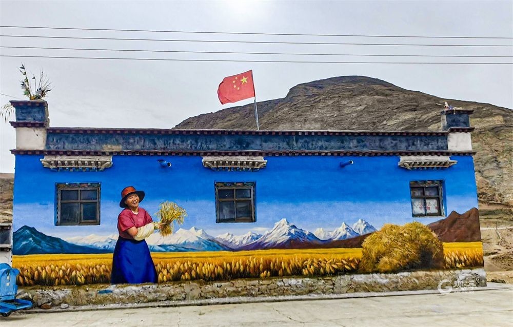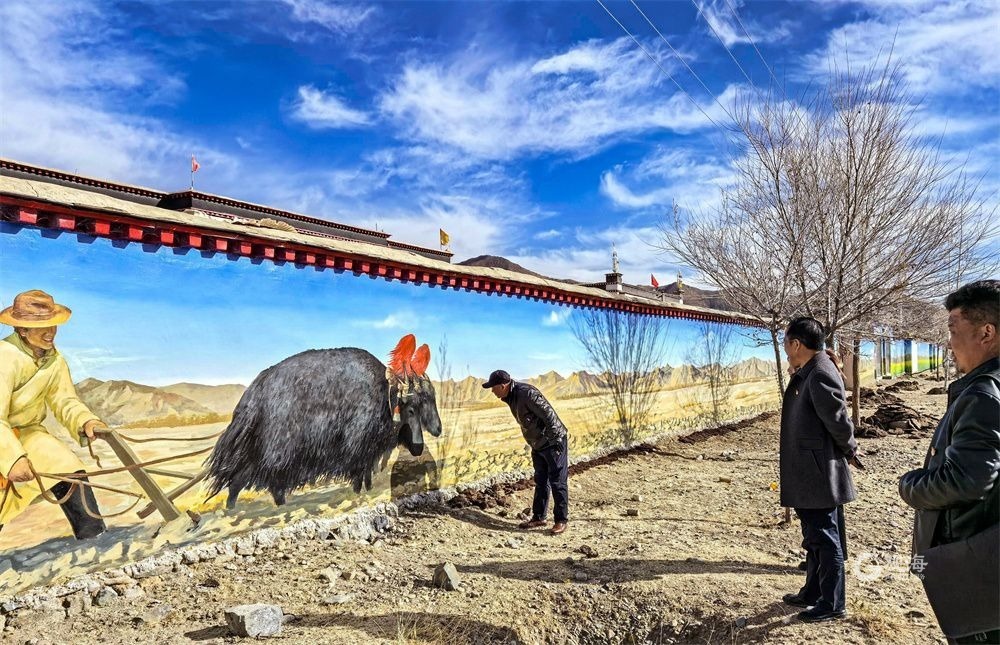 廣袤的高原上,在連綿起伏的山巒之下,是藏族農(nóng)家趕著傳統(tǒng)的“二牛抬杠”耕耘的場(chǎng)景,旁邊的“阿佳”則撒下希望的青稞種子……這樣的場(chǎng)景當(dāng)然不會(huì)出現(xiàn)在現(xiàn)在這個(gè)滴水成冰的季節(jié),而是躍然于藏家傳統(tǒng)村居的院墻之上?!拔壹疫@面墻原來(lái)就是貼滿了牛糞,現(xiàn)在畫上了我們平時(shí)勞動(dòng)的景象,感覺(jué)比之前更好看了?!鄙V樽螀^(qū)東嘎鄉(xiāng)色定村的村民旦瓊說(shuō),此前的一年又一年,他都是把牛糞貼在墻上,固然有傳統(tǒng)的高原美感,但是與現(xiàn)在院墻上畫的鄉(xiāng)村振興的場(chǎng)景相比,還是現(xiàn)在的感覺(jué)更不錯(cuò)。