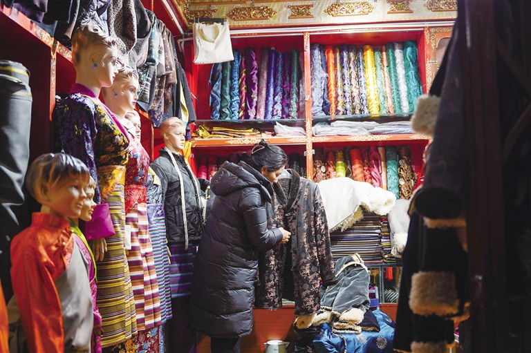 “最近越來越冷了,所以我今天來給女兒買一件厚點的藏裝,剛好她生日也快到了?!弊哌M(jìn)位于北京東路的222藏裝店,琳瑯滿目、顏色絢麗的冬款藏裝讓人眼前一亮,市民尼瑪拉姆正在給女兒挑選藏裝。一旁,店員則在給客人測量三圍、取藏裝、介紹款式,忙得不可開交。