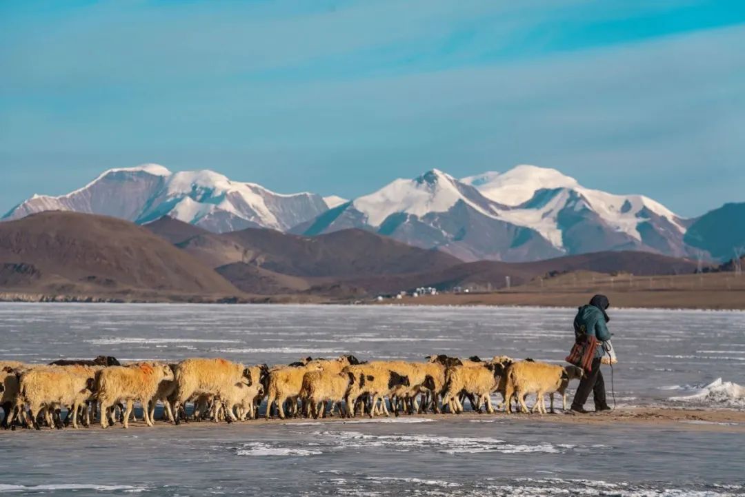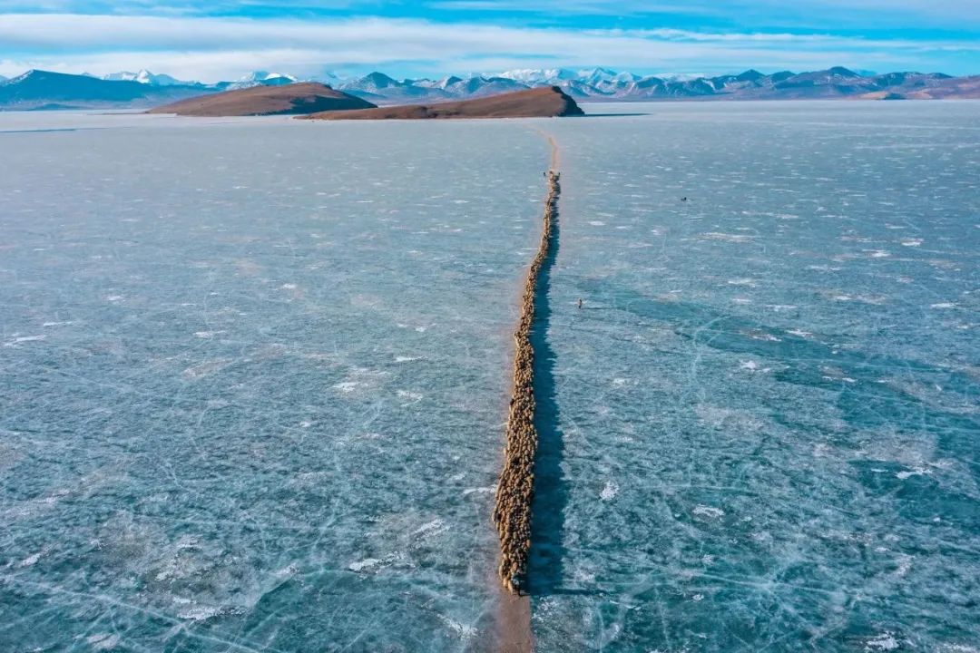 它是世界上海拔最高的村落之一,當(dāng)?shù)卮迕穸家苑拍翞樯?。寒冬來臨,岸上的牧場草料已經(jīng)不夠羊群過冬,推瓦村的村民們把羊群集結(jié)在一起,在冰湖上撒牛糞爐灰,畫出一道冰面上的“羊腸小道”把羊群趕上普姆雍錯(cuò)湖心島上吃草過冬,雖然只有幾公里的距離,但這個(gè)傳承千年的畫面卻給人以史詩般的震撼與感動(dòng)。