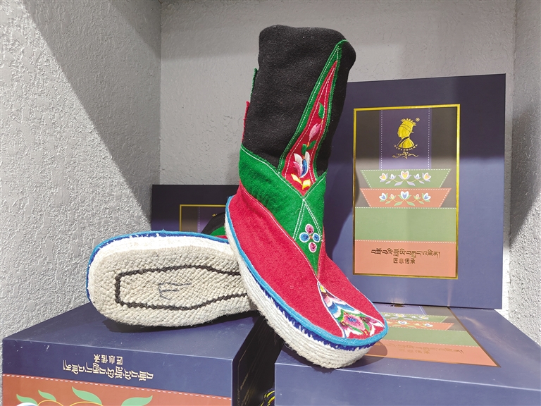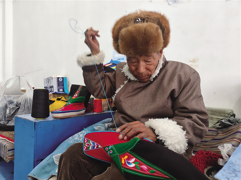 “藏靴樣式精美、花色靚麗,因材質和花色的不同分為‘郭扎’‘郭朵’‘松巴’三種?!枪?jié)慶時穿,‘郭朵’‘松巴’可以日常穿,制作一雙藏靴需要一周左右的時間。這些藏靴不分左右,磨損后可以互換,還可以防潮防寒。”正在縫制藏靴的索朗頓珠雙手稍顯粗糲卻不失靈巧,他邊飛針走線,邊給記者介紹著手中的藏靴。厚而輕的鞋底、柔軟的靴面,五顏六色的絲線繡出栩栩如生的多瓣蓮花,加上氆氌制成的鞋面,一雙極具民族特色的藏靴展現(xiàn)在眼前。