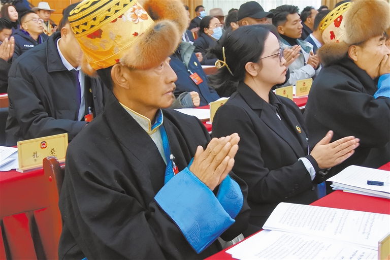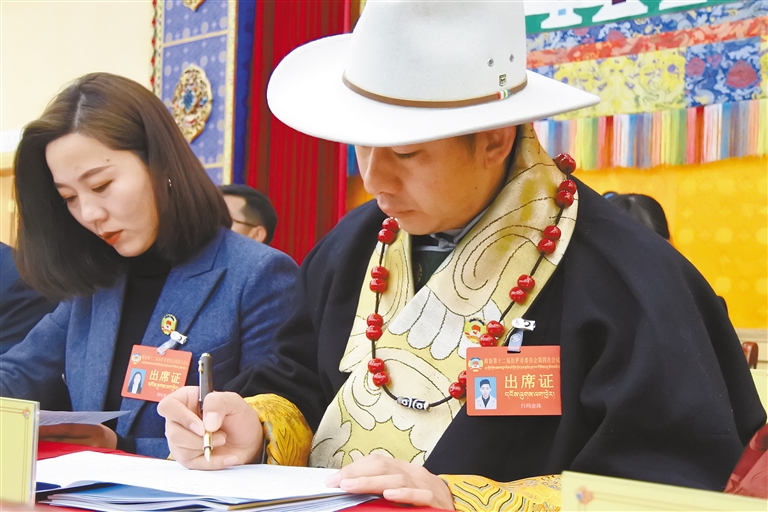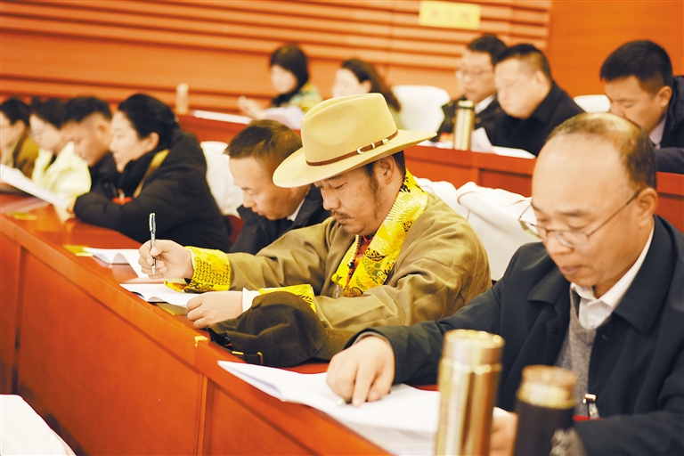 圖為基層委員認(rèn)真聆聽政協(xié)拉薩市委員會工作報告。