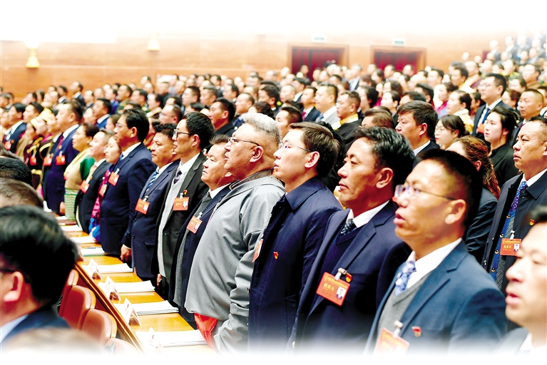 圖為西藏自治區(qū)人大代表們齊唱國(guó)歌。 記者 潘多 攝