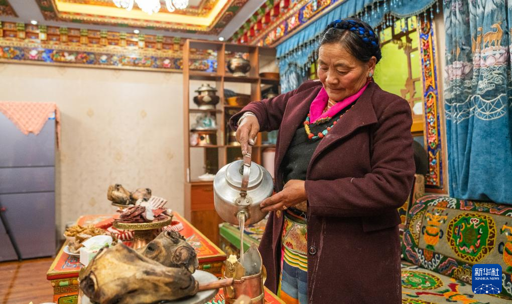 巴桑普尺在倒青稞酒(1月10日攝)。新華社發(fā)(丁增尼達(dá) 攝)