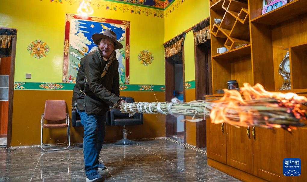 巴桑普尺的家人拿著火把舉行傳統(tǒng)儀式(1月10日攝)。新華社發(fā)(丁增尼達(dá) 攝)