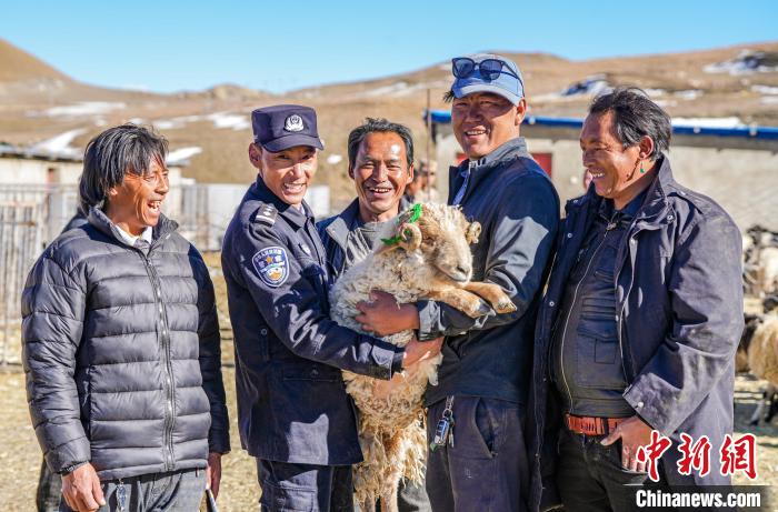 圖為崗巴邊境派出所若木新村警務室民警巴桑次仁在合作社見證分羊。葉軼 攝