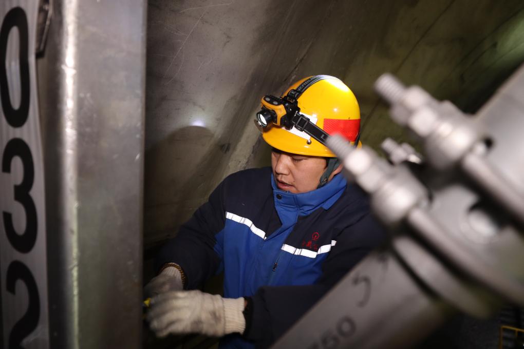 拉薩南接觸網(wǎng)維修隊工長對接觸網(wǎng)設(shè)備進行檢修(1月24日攝)。新華社記者 劉洲鵬 攝
