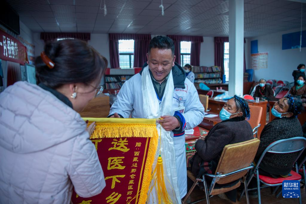 義診活動即將結(jié)束時,拉布村駐村工作隊為加央和同事們送來了錦旗。工作隊隊長邊巴卓瑪講:“義診活動很有意義。醫(yī)生們到了村里,能解決農(nóng)牧民看病難的問題,我們真的很感謝他們。”