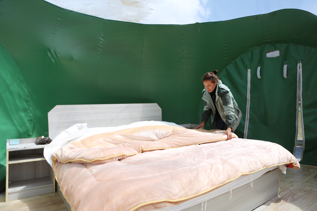 每個煙雨朦朧的清晨,都是夫妻倆最忙碌的時候。白瑪?shù)录?fù)責(zé)民宿房間內(nèi)的保潔工作,丈夫殷合做一些手工活,制作民宿的木桌木椅等用具。夫妻倆就這么一天天地過著,忙得不亦樂乎。