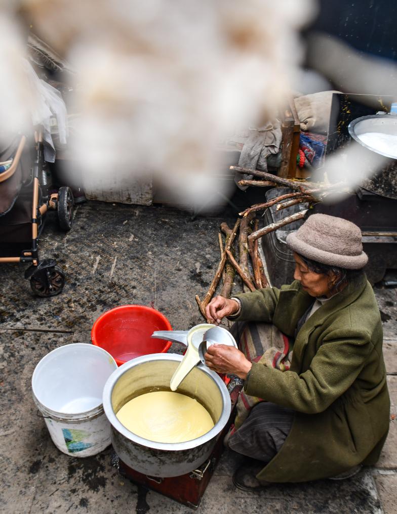 2023年6月10日,卓嘎在牧場的小屋里制作酥油。新華社記者 晉美多吉 攝