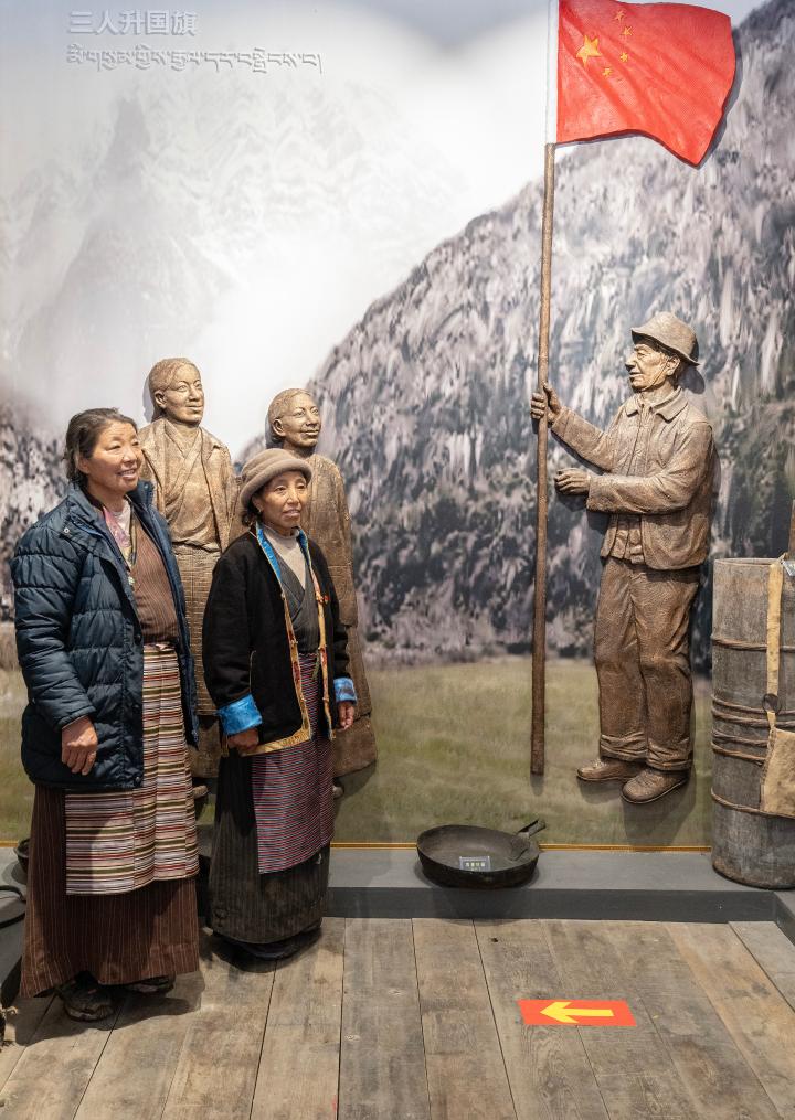 2023年6月10日,卓嘎(右)和央宗在桑杰曲巴故居中與描繪桑杰曲巴用自己縫制的國旗舉行升旗儀式場景的壁畫前合影。新華社記者 費(fèi)茂華 攝
