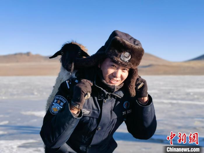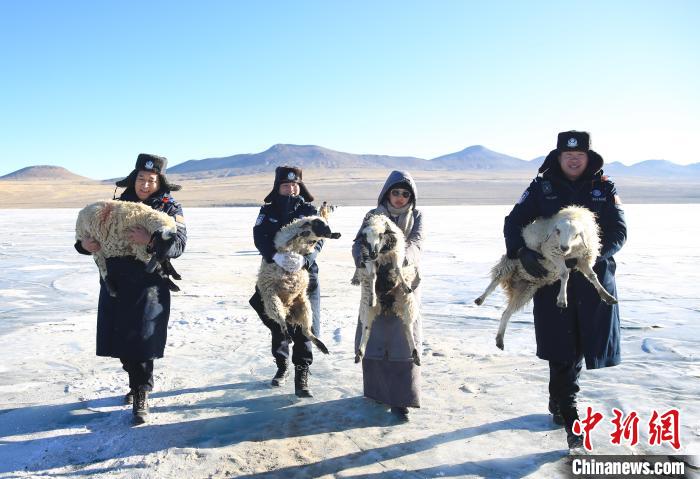 在光滑的冰面上,不時有小羊摔倒,甚至有“懶惰”的大羊直接“趴窩”不前,民警們不是將他們抱著就是扶著前行。在海拔5070米的冰面上負(fù)重前行,民警大口喘著粗氣,還時不時踩滑摔跤,但臉上始終洋溢著幸福的笑容。