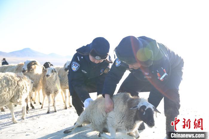 圖為西藏出入境邊防檢查總站浪卡子邊境管理大隊民警扶起摔倒的綿羊。彭維熙 攝
