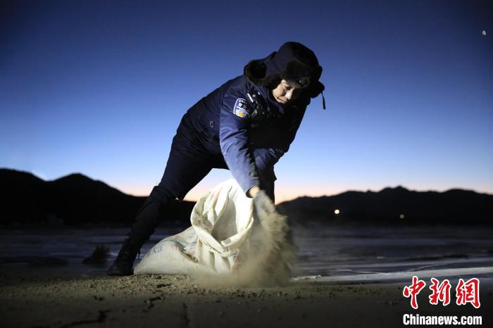 圖為西藏出入境邊防檢查總站浪卡子邊境管理大隊民警在冰面拋灑牛糞爐灰。彭維熙 攝