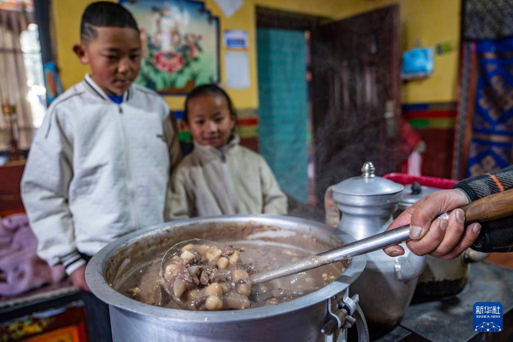 在位于西藏拉薩市當雄縣公塘鄉(xiāng)甲根村的家中,斯曲旺姆的重孫子和重孫女在等待“古突”上桌(2月8日攝)。新華社記者 孫非 攝