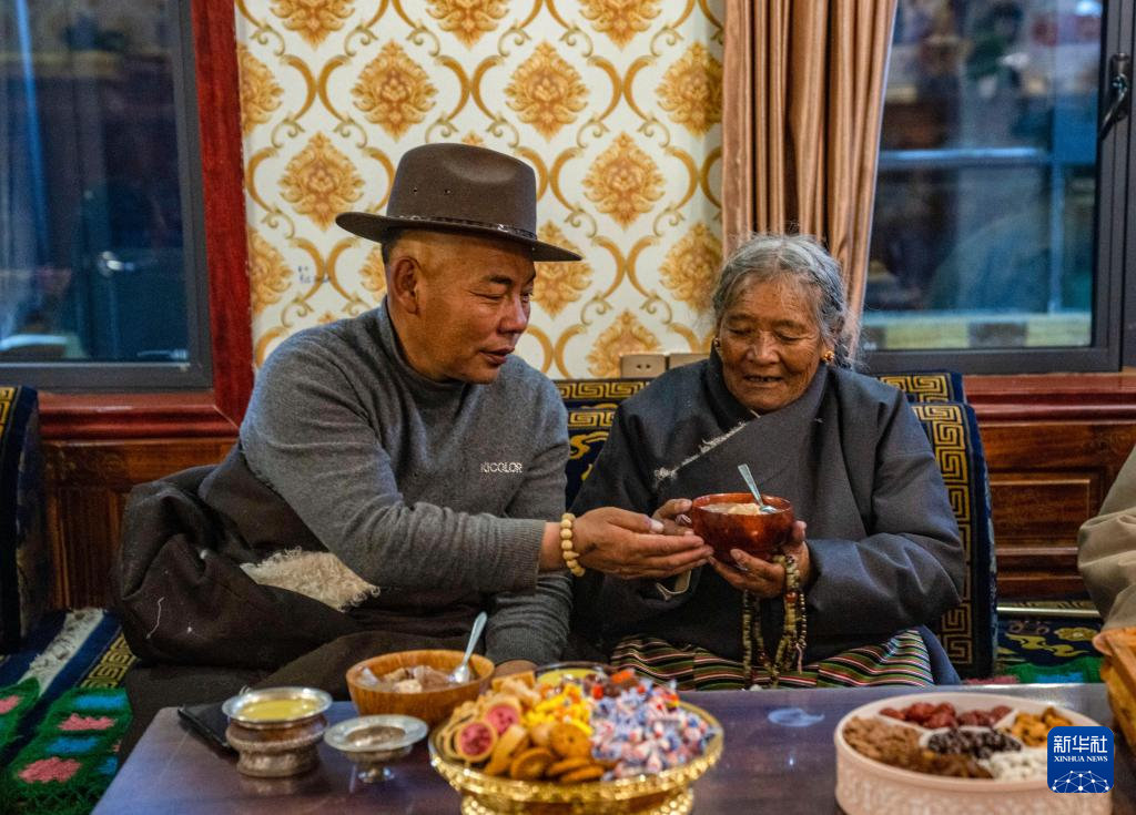 在位于西藏拉薩市當雄縣公塘鄉(xiāng)甲根村的家中,斯曲旺姆的兒子索朗羅達為母親端上“古突”(2月8日攝)。新華社記者 孫非 攝