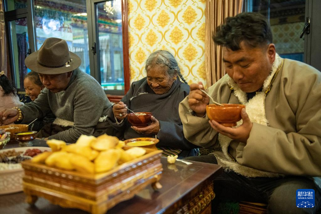 在西藏拉薩市當雄縣公塘鄉(xiāng)甲根村,整個村子沉浸在節(jié)日氣氛中。村里的斯曲旺姆老人家四世同堂,房屋寬敞明亮。手里捧著盛滿“古突”的木碗,斯曲旺姆老人希望這樣的幸福能長長久久。