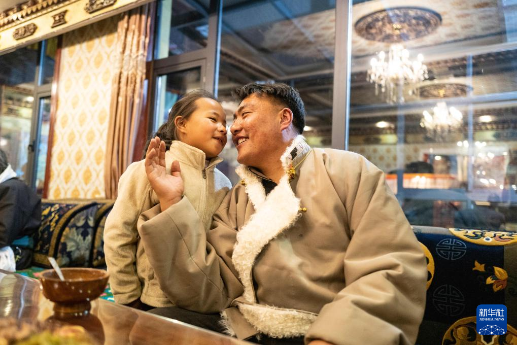 在位于西藏拉薩市當雄縣公塘鄉(xiāng)甲根村的家中,斯曲旺姆的孫子巴桑羅布(右)和重孫女央金拉姆在飯后聊天(2月8日攝)。新華社記者 孫瑞博 攝