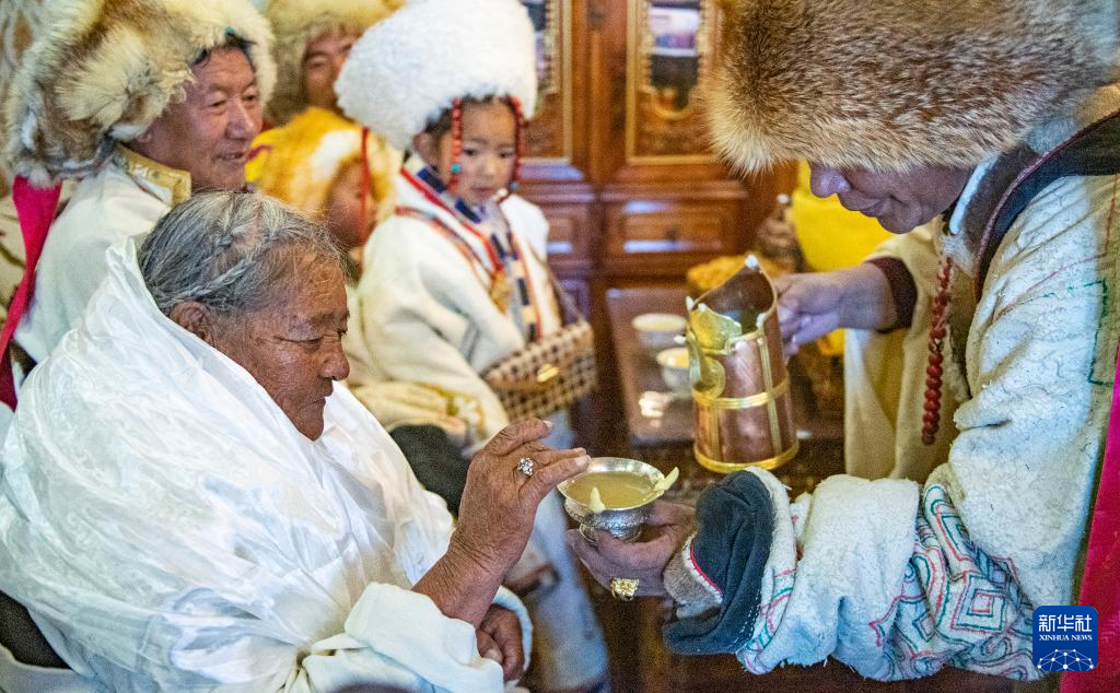 在位于西藏拉薩市當(dāng)雄縣公塘鄉(xiāng)甲根村的家中,斯曲旺姆正在接受兒女們敬酒(2月10日攝)。新華社記者 孫瑞博 攝