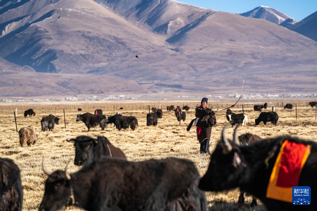 斯曲旺姆的兒子索朗羅達(dá)將家里的牦牛趕到牧場上(2月10日攝)。新華社記者 丁增尼達(dá) 攝