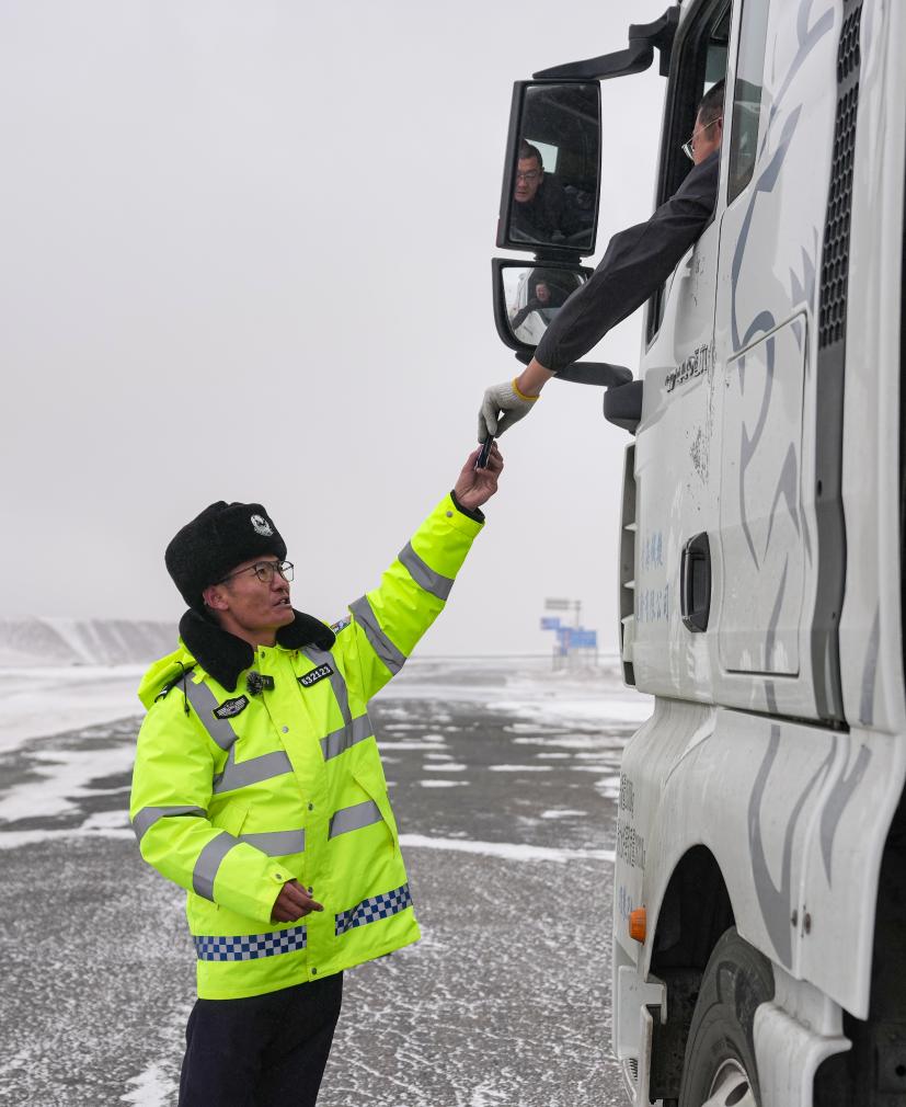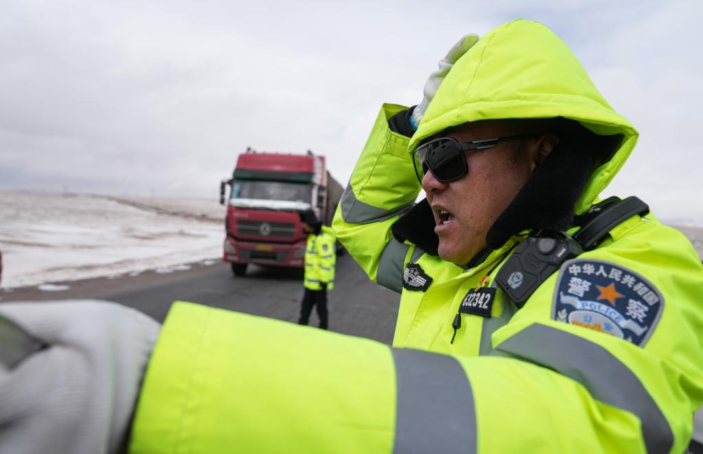 安多交警大隊(duì)秩序中隊(duì)隊(duì)長達(dá)娃云旦提醒駕駛員雪天小心駕駛。新華社記者 晉美多吉 攝