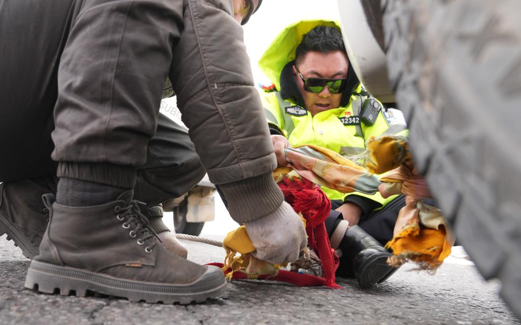 安多交警大隊(duì)交警幫助故障車輛安裝拖拽繩。新華社記者 晉美多吉 攝