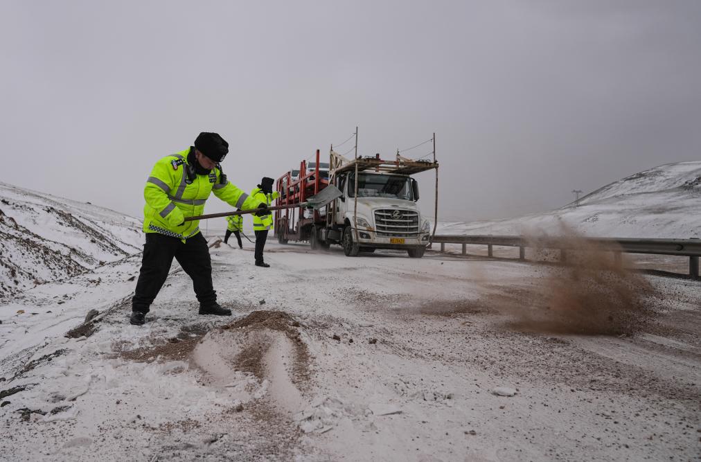 安多交警大隊(duì)交警在冰雪路段撒土止滑。新華社記者 晉美多吉 攝