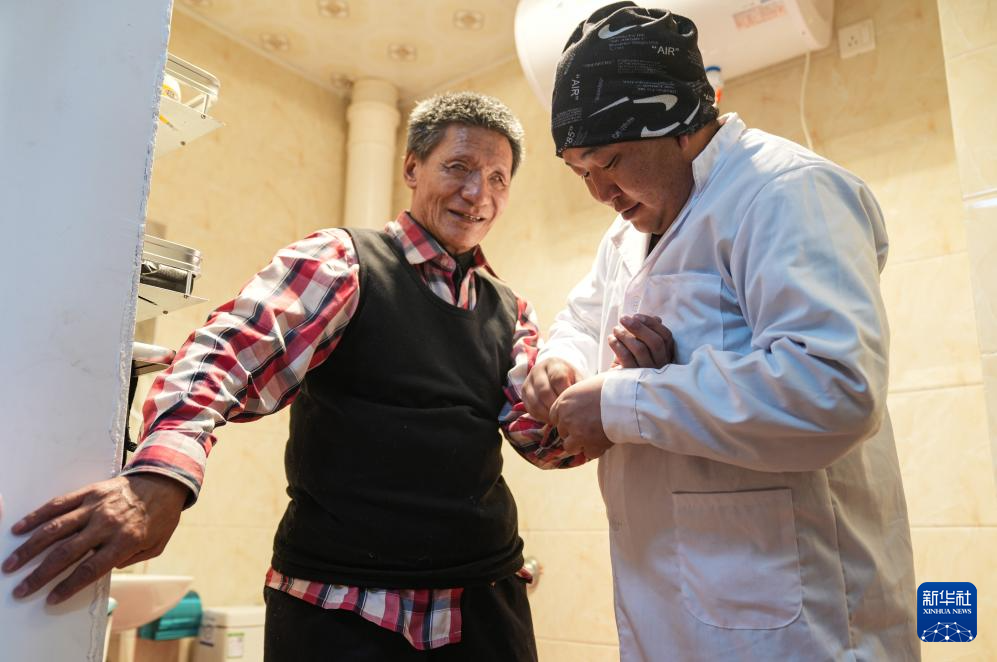 服務(wù)中心工作人員在幫助失明老人洗漱(1月30日攝)。新華社記者 晉美多吉 攝