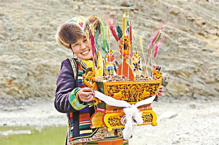 制作“切瑪”盒是藏歷新年一項歷史悠久的習(xí)俗,代表著群眾對五谷豐登的美好期盼。圖為瓊結(jié)縣唐布齊村群眾身著節(jié)日盛裝,端出精心制作的“切瑪”盒。