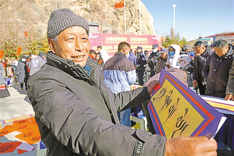 山南市文聯(lián)組織書法家走進(jìn)瓊結(jié)縣,開展“我們的中國夢——文化進(jìn)萬家”活動。圖為群眾展示獲贈的藏文書法作品。