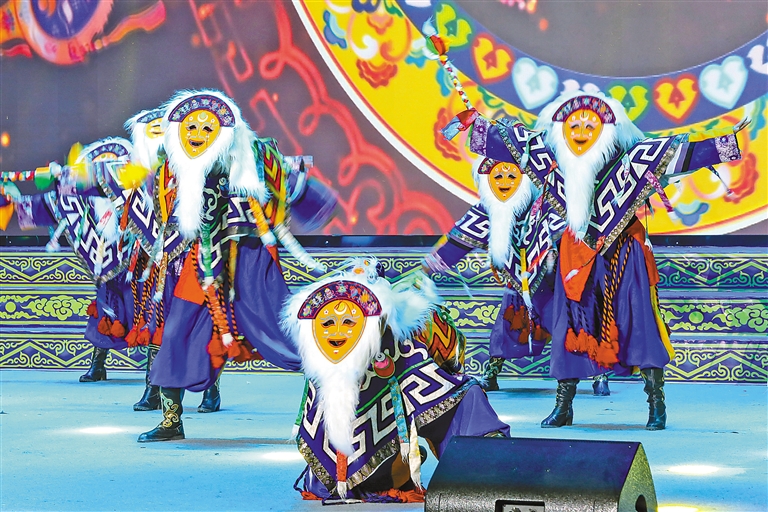 洛扎縣組織縣藝術(shù)團(tuán)、農(nóng)牧民表演隊等精心舉辦“大地歡歌 美麗洛扎”村晚。圖為村晚上的藏戲表演。