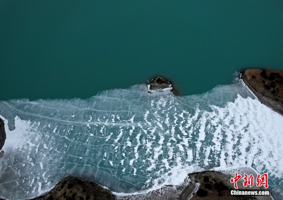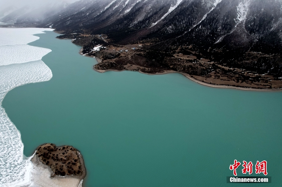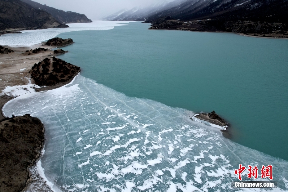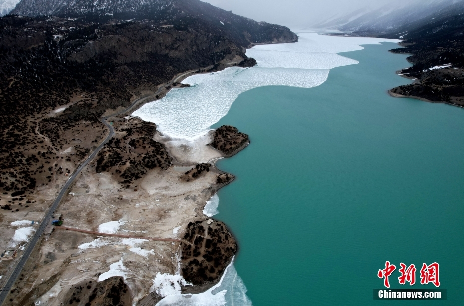2月21日,西藏昌都市八宿縣,然烏湖半冰半水的湖面如畫一般,美不勝收。(無人機照片)中新社記者 李林 攝