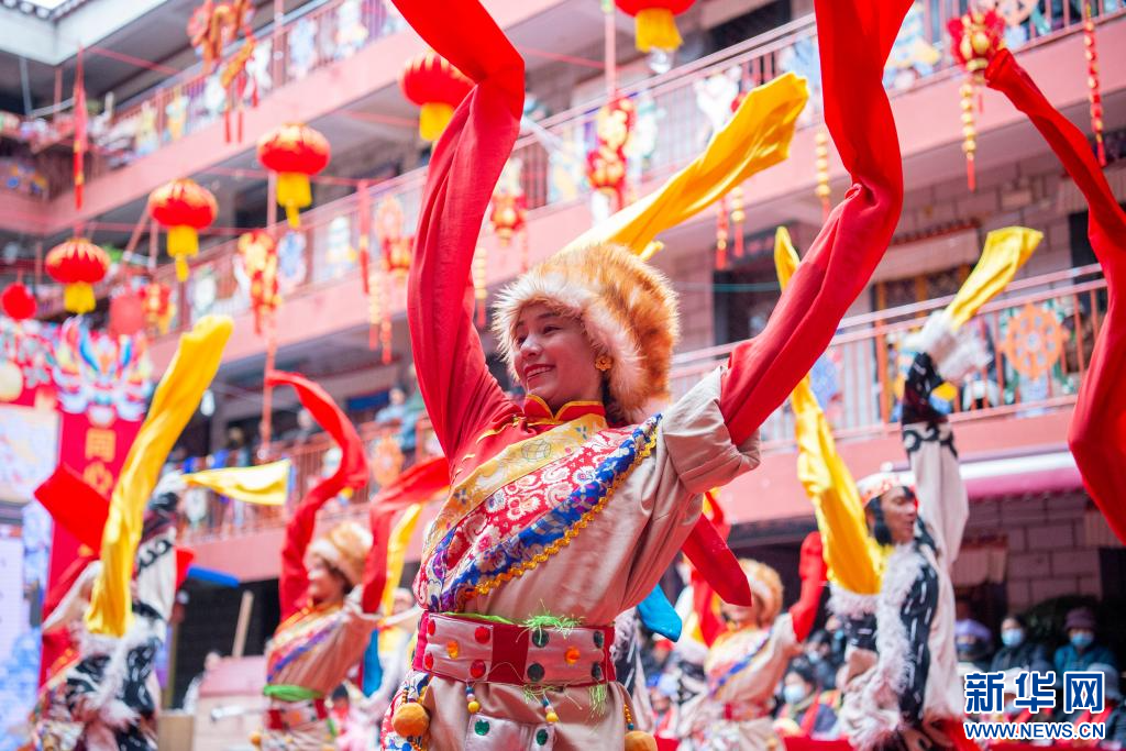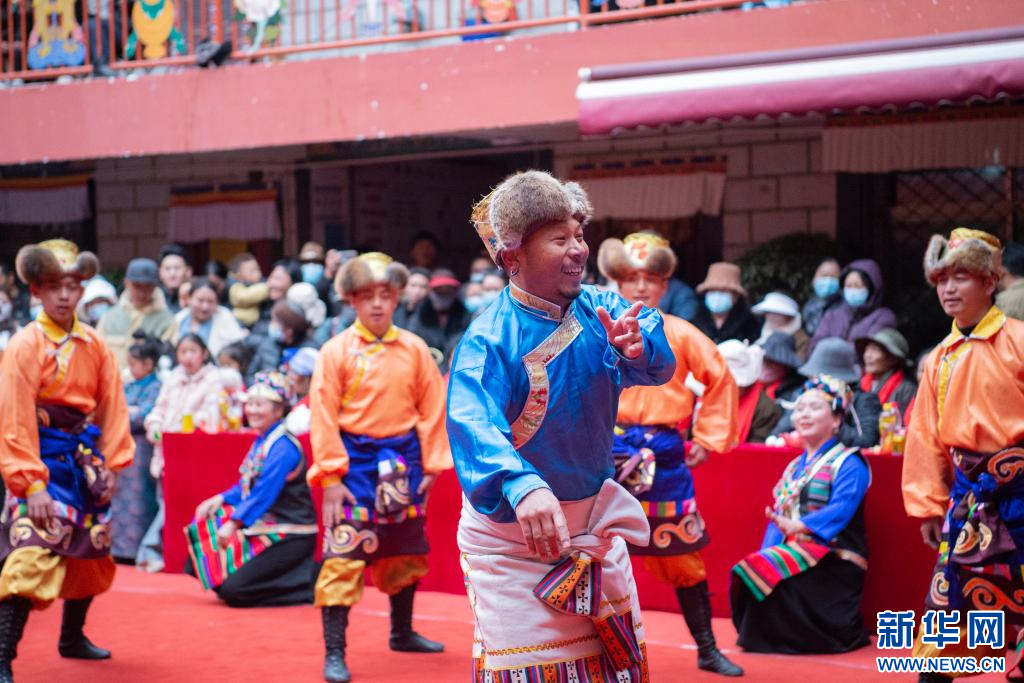 2月23日,拉薩市城關區(qū)雪巴拉姆藝術團的演員在德賽大院里表演。新華網(wǎng) 旦增努布 攝