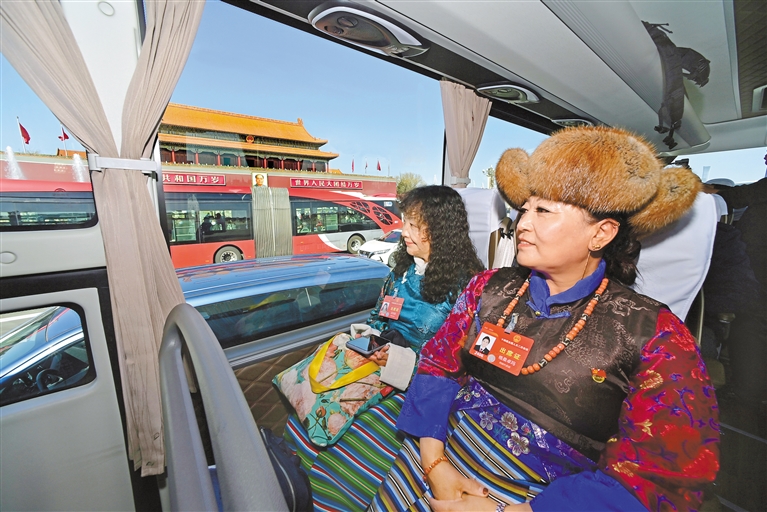 圖為人大代表們在前往駐地的途中經(jīng)過天安門。記者 旦增西旦 攝