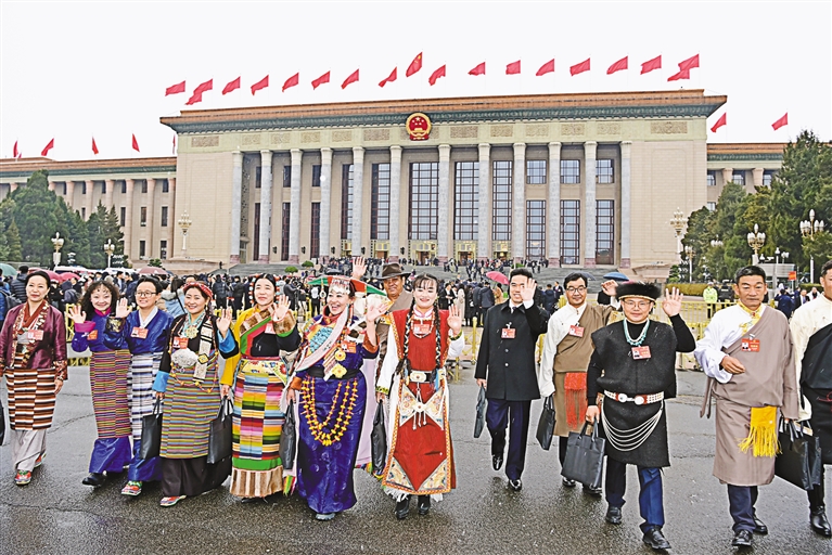 圖為全國(guó)人大代表聆聽(tīng)政府工作報(bào)告后,滿(mǎn)懷信心走出人民大會(huì)堂。記者 旦增西旦 攝