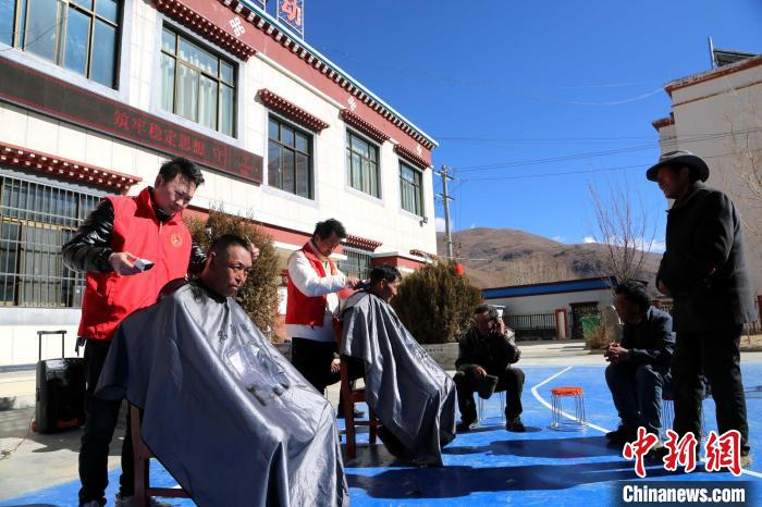 圖為理發(fā)店店長(zhǎng)劉陽(yáng)(左一)為民眾提供免費(fèi)理發(fā)服務(wù)。倫珠澤仁攝