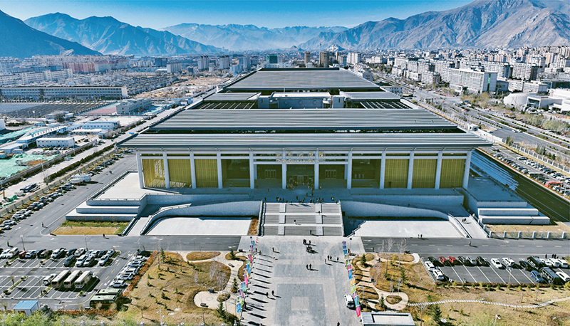 2023年12月15日,西藏大劇院開臺演出活動舉行,西藏文化新地標西藏大劇院正式啟用。圖為空中俯瞰西藏大劇院(無人機照片)。 新華社記者 晉美多吉/攝