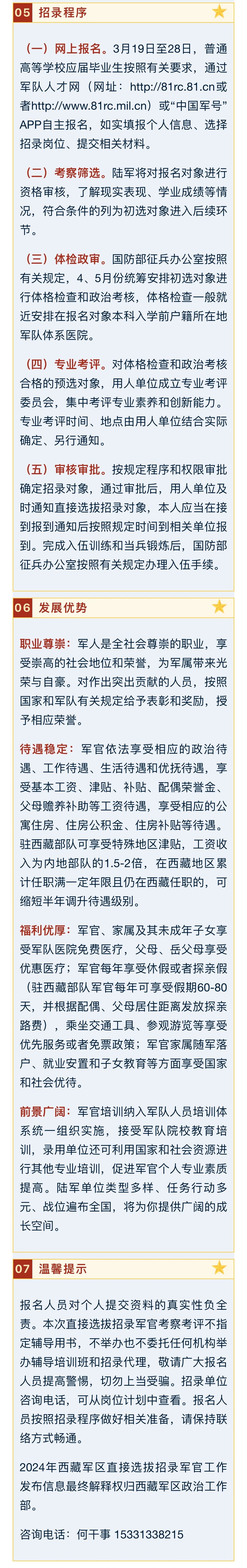 根據(jù)軍隊有關政策規(guī)定,按照全軍統(tǒng)一部署,現(xiàn)就2024年上半年西藏軍區(qū)直接選拔招錄軍官有關事項公告如下: